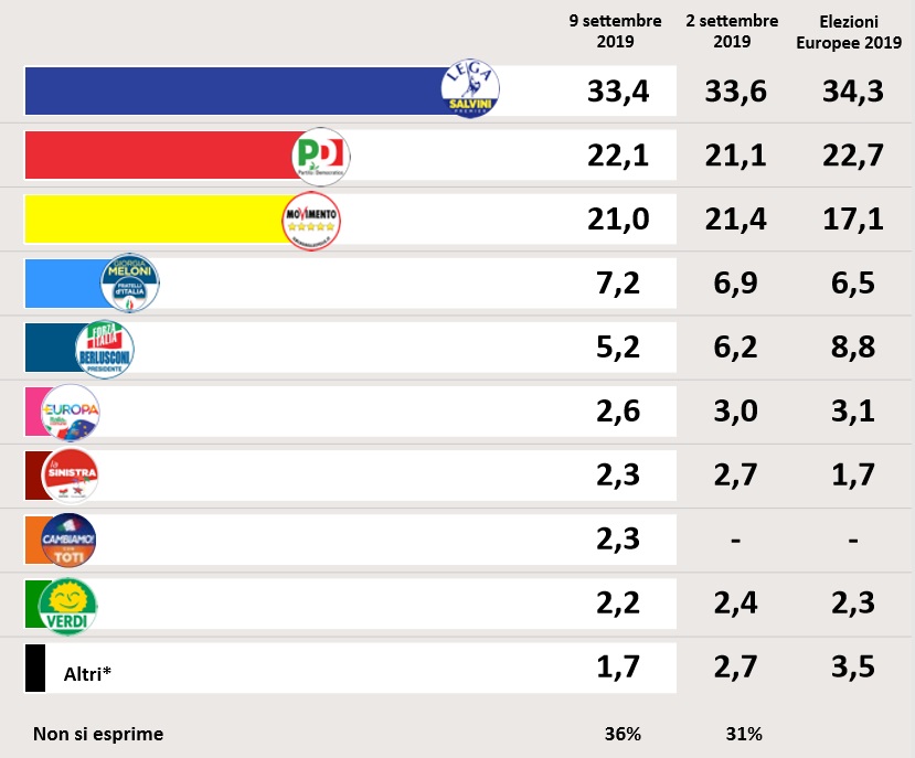 Nessun partito fa peggio dei dem: -0,6% negli ultimi sette giorni. Sarà l’effetto risucchio della nuova entità politica di Matteo Renzi? Non è propriamente corretto, visto che Italia Viva, rispetto alla stima del 7 ottobre, ha perso lo 0,3% dei consensi. Una contrazione, seppure lieve, a quattro giorni dall’inizio della decima Leopolda a Firenze, dove tra l’altro sarà presentato il logo del nuovo partito, che non giustifica la caduta di indice di gradimento del Partito democratico.