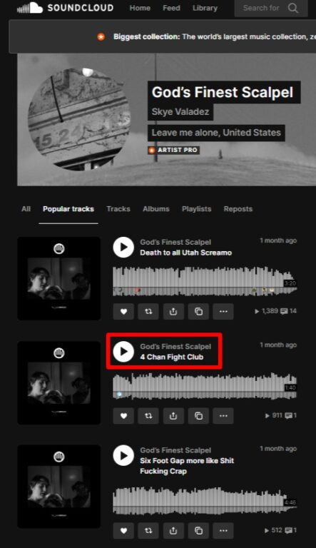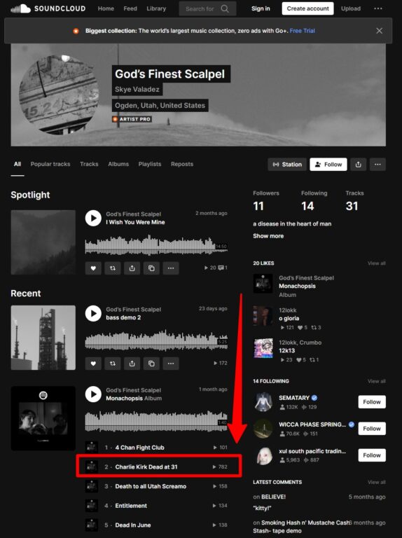 Su Soundcloud esisteva già da almeno un mese una canzone dal titolo “Charlie Kirk Dead at 31” (archiviato qui). Il brano è riemerso nelle ore successive alla notizia dell’omicidio attraverso una banale ricerca Google, diventando inevitabilmente materiale per teorie e sospetti, o in certi casi presunte certezze da fornire all’FBI. Il fatto che la canzone fosse stata caricata prima della morte effettiva di Charlie Kirk, all’età di 31 anni, ha alimentato ipotesi di un possibile “manifesto” o di un legame con l’attentato. L’account dove era stata caricata si chiamava “God’s Finest Scalpel” (archiviato qui), con sotto riportato il nome “Skye Valadez” e la residenza “Ogden, Utah, United States”. Un profilo “perfetto” per scatenare la “caccia all’uomo”.