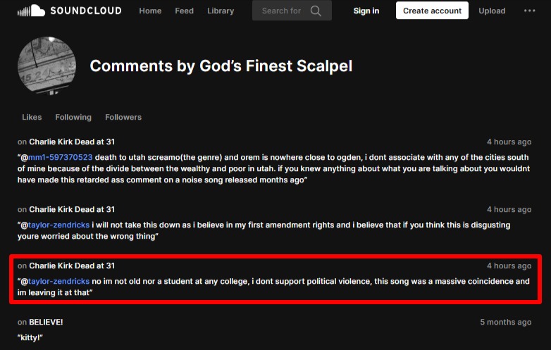 L’account Soundcloud non conteneva solo il brano “Charlie Kirk Dead at 31”. È ancora possibile ascoltare altri audio caricati dallo stesso utente su diverse piattaforme. Si tratta per lo più di interpretazioni amatoriali, mal registrate, dove viene suonata la chitarra senza testi o accompagnamenti.