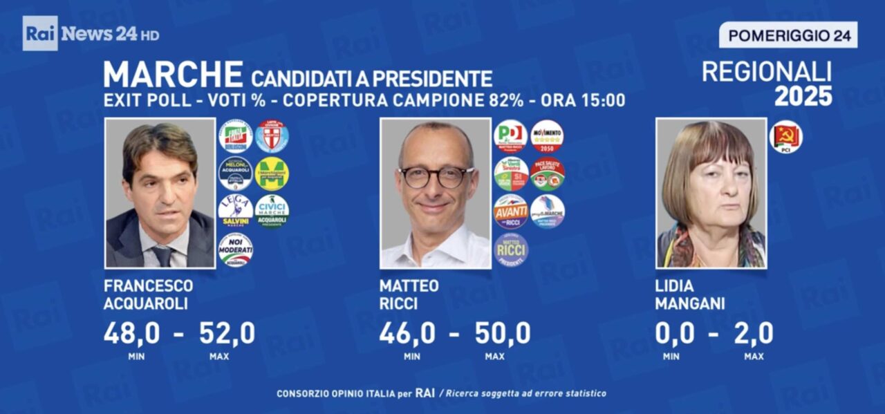 Secondo i primi exit poll di Opinio per Rai, l’uscente Francesco Acquaroli, candidato del centrodestra, è in vantaggio di due punti su Matteo Ricci, esponente del centrosinistra, con una forbice compresa tra il 48% e il 52% contro il 46%–50% dell’avversario.
