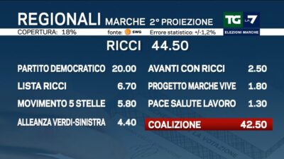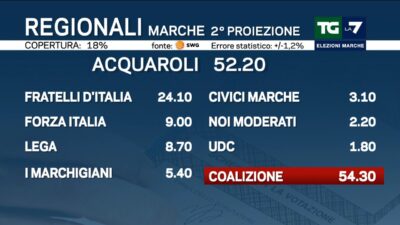 La seconda proiezione di Swg per La 7 per le regionali nelle Marche, con una copertura al 18%, danno il candidato di centrodestra Francesco Acquaroli al 52,2% e quello di centrosinistra Matteo Ricci al 44,5%.