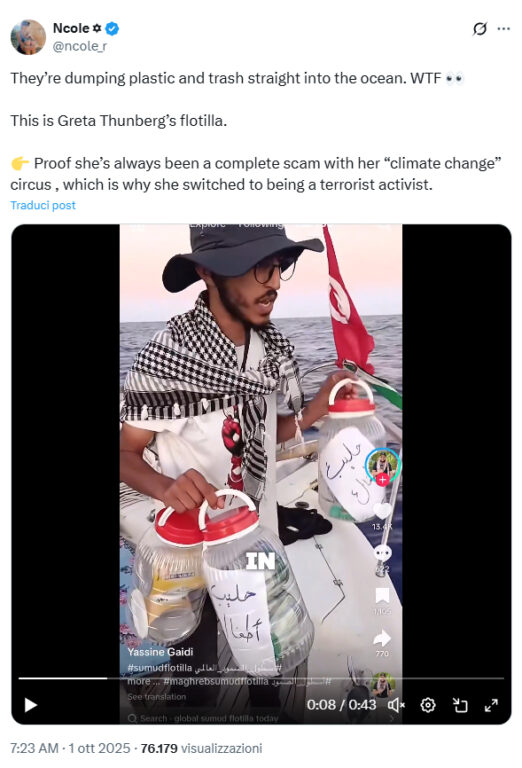 Un video diffuso sui social mostra un attivista della Global Sumud Flotilla lanciare in mare dei barattoli di plastica contenenti aiuti come latte in polvere per bambini, opportunamente sigillati per evitare l’ingresso di acqua, probabilmente nella speranza che possano raggiungere la costa in caso di blocco della missione. Le immagini hanno scatenato diverse critiche non solo contro l’attivista. Infatti, diversi utenti hanno puntato il dito contro Greta Thunberg, sottolineando la contraddizione tra la sua battaglia ecologista e un atto che viene percepito come inutile e inquinante.
