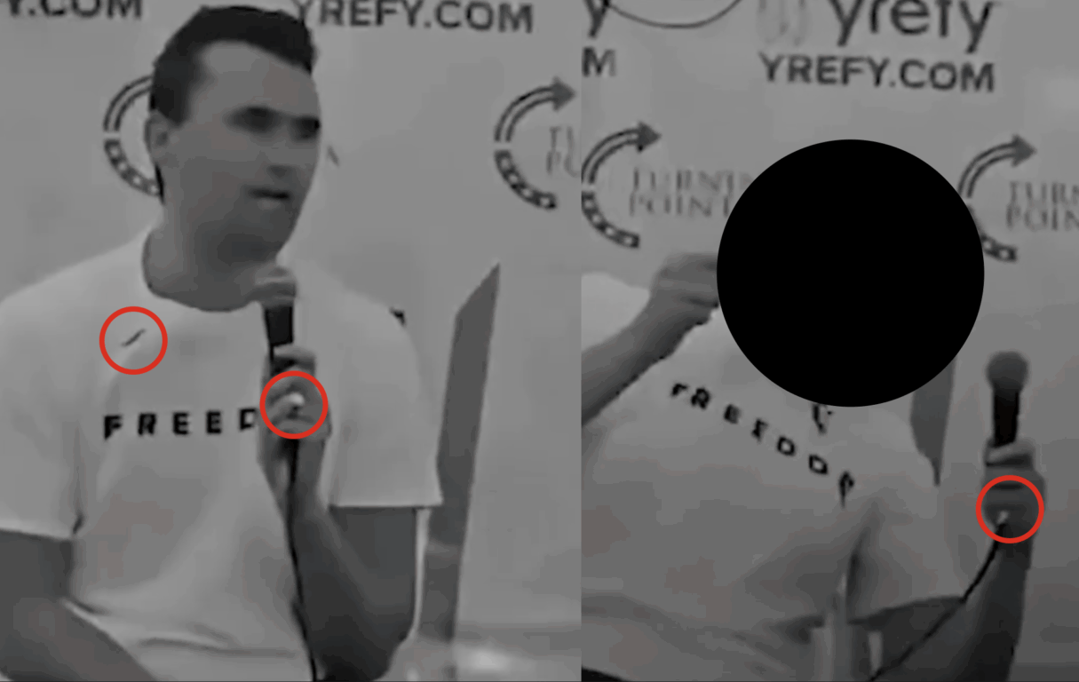 Il collega Matthew Elmas aveva già pubblicato una analisi per AAP FactCheck, facendo quel che si dovrebbe sempre fare: controllare se per caso si vedeva lo stesso oggetto nei precedenti eventi pubblici di Kirk e se fosse più plausibile un’altra spiegazione. L’oggetto nero era ben visibile durante l’ultimo dibattito di Kirk, come è possibile verificare da chiunque cercando le immagini in Rete: