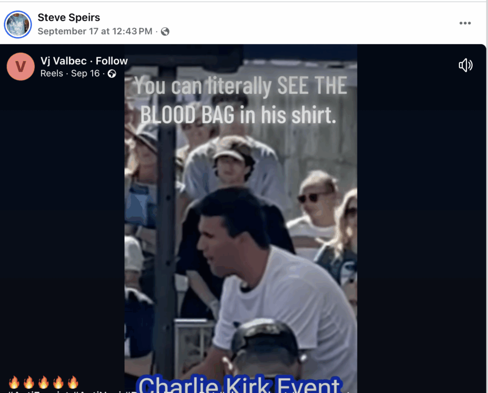 Il noto teorico delle Scie chimiche, nonché condannato in via definitiva Rosario Marcianò, ha recentemente pubblicato un post dove si interroga riguardo a una presunta macchia di sangue che si vedrebbe sulla t-shirt di Charlie Kirk, la quale scompare appena riceve il colpo di fucile che lo ucciderà. Inoltre, tra chi commenta c’è chi fa notare che l’anello di Kirk sembra cambiare posizione dopo lo sparo. «L’omicidio di Charlie Kirk è una simulazione?», leggiamo nel post. No! Si tratta di due “fenomeni” che hanno già una spiegazione. Infatti queste narrazioni non sono originali, circolano già da diverso tempo tra i complottisti americani, dove il “mistero” che tratta Marcianò è noto come «blood bag».