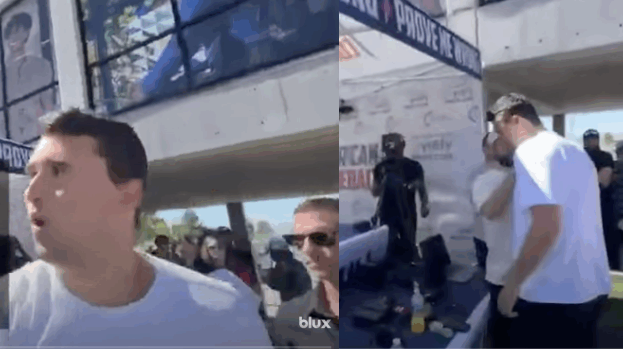 Una macchia di “sangue” è visibile sulla t-shirt ben prima dello sparo. Si nota anche una sorta di tubo, nascosto sotto la maglietta. La piccola traccia di “sangue” si sposta verso il collo di Charlie Kirk. Si tratta di un dispositivo di scena attivato da remoto?