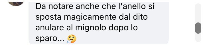 Da notare anche che l’anello si sposta magicamente dal dito anulare al mignolo dopo lo sparo…