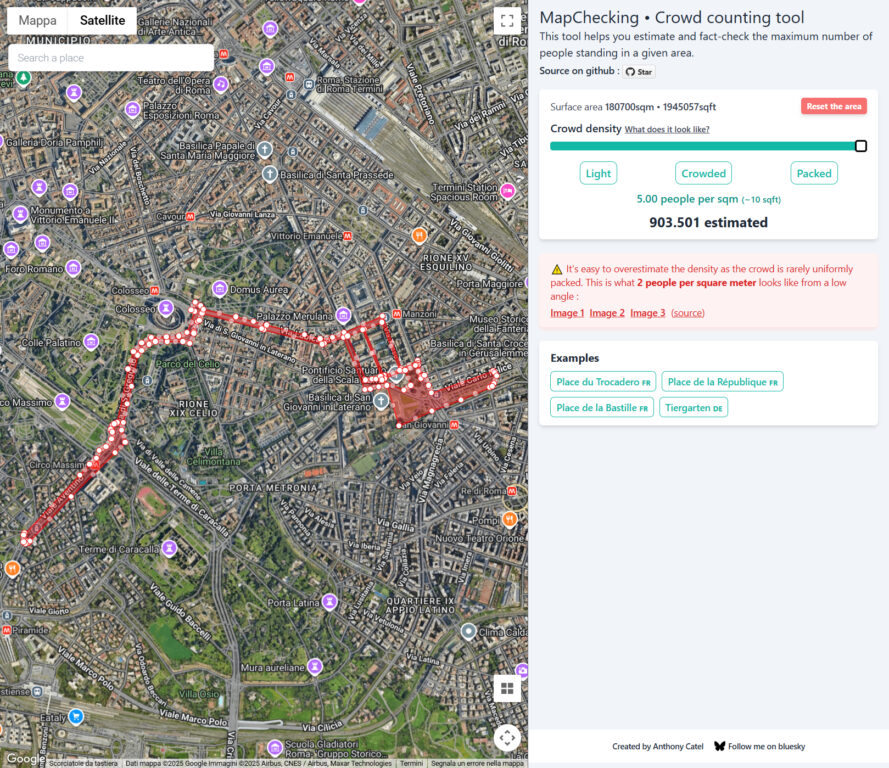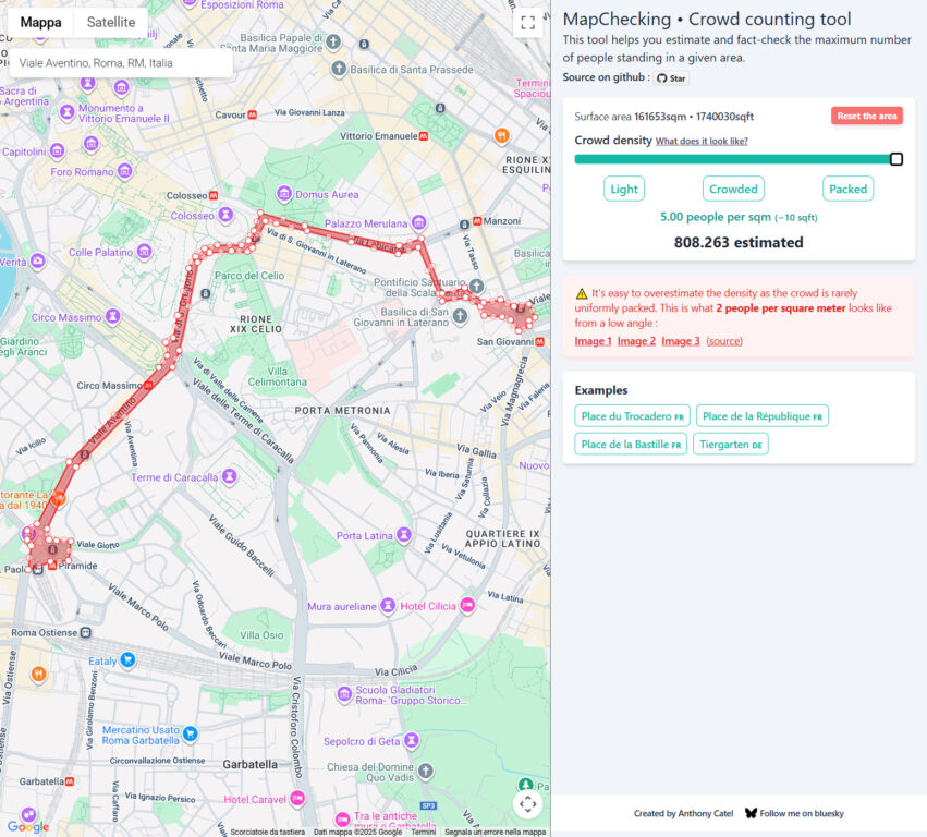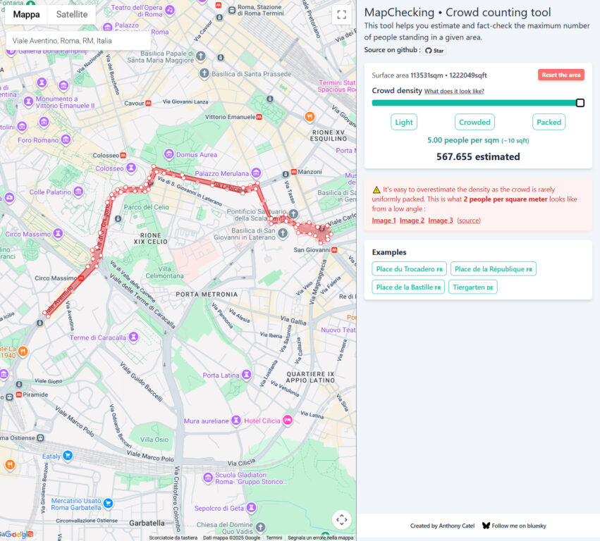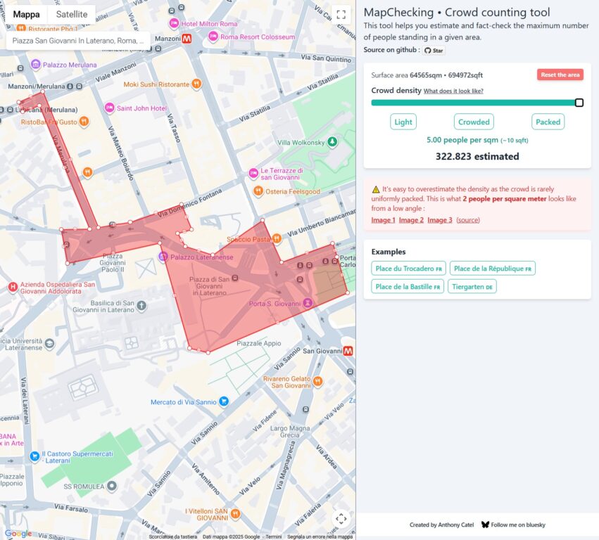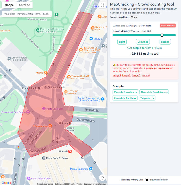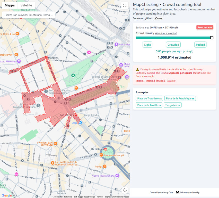 Per questa verifica abbiamo utilizzato MapChecking, uno strumento online che permette di stimare quante persone possono occupare una determinata area geografica in base alla densità della folla. Il sito calcola la superficie selezionata sulla mappa e applica un coefficiente di affollamento espresso in persone per metro quadrato. Per la nostra simulazione, abbiamo impostato il calcolo in base alla presenza di 4 persone per metro quadrato, ossia una densità molto alta nel contesto di una manifestazione reale ed equivalente a una folla uniformemente stipata, con pochissimo spazio per muoversi.