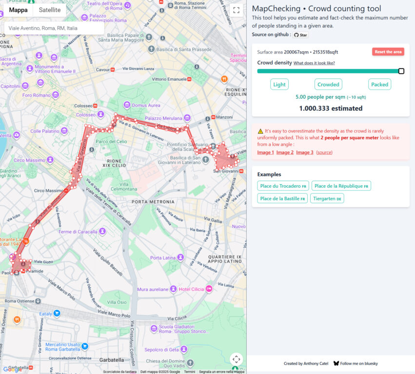 Per raggiungere quella cifra, bisognerebbe considerare una base di 5 persone per metro quadrato e un’area molto più ampia, comprendente piazza San Giovanni, le strade e le piazze circostanti fino a piazza Santa Croce in Gerusalemme, includendo anche zone non accessibili o non percorse dal corteo.