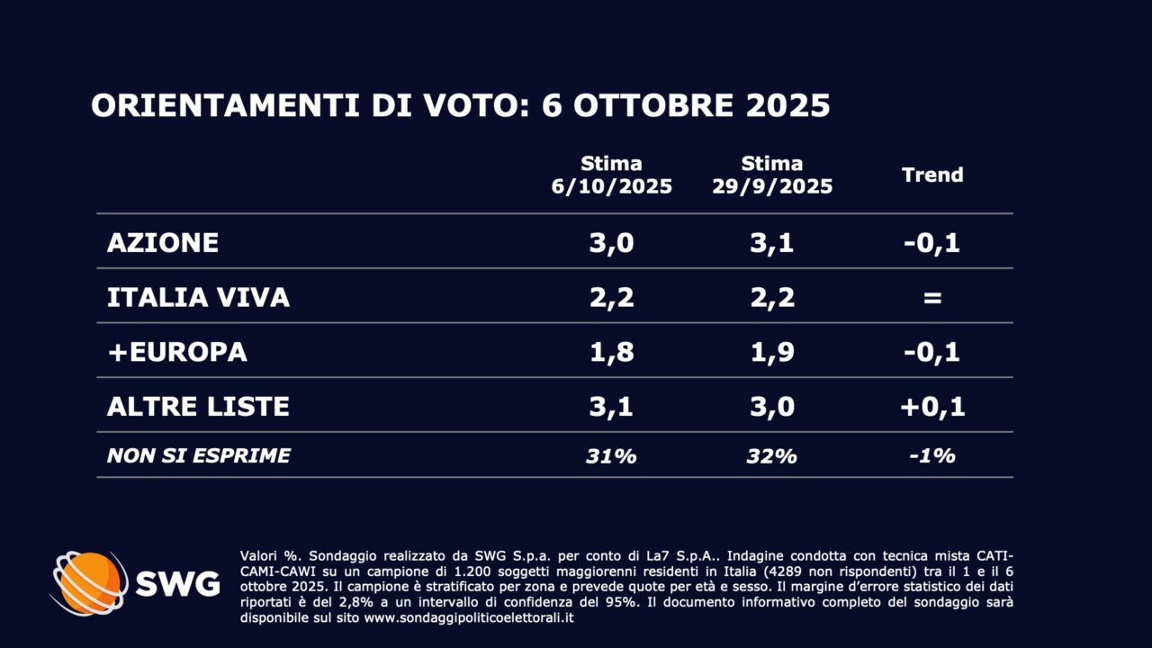 Tra le forze politiche minori, frenano Azione e +Europa. Stabile invece Italia Viva.