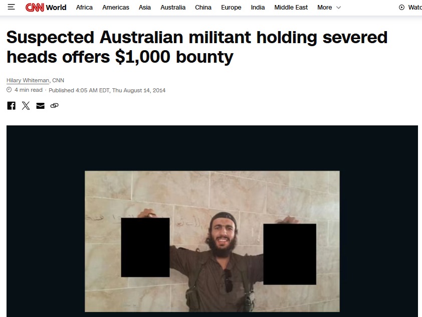 - La foto delle teste risale al 2014, e mostra il militante australiano Mohamed Elomar, non il presidente Ahmed al-Sharaa.