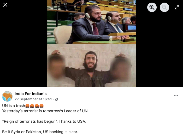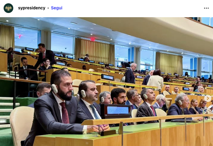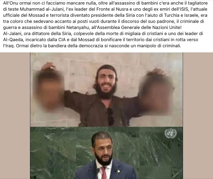 La notizia si è sparsa velocemente nei giorni successivi alla conferenza delle Nazioni Unite tenutasi questo settembre 2025. Un collage che accosta una foto ufficiale del Presidente siriano con una immagine piuttosto cruda proveniente dalla propaganda jihadista ha fatto il giro dei social.