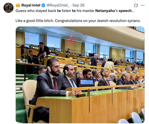 Si accusa infatti il Presidente Siriano Al-Sharaa di essere il terrorista ritratto tenendo le due teste e di aver supportato Israele alle Nazioni Unite.