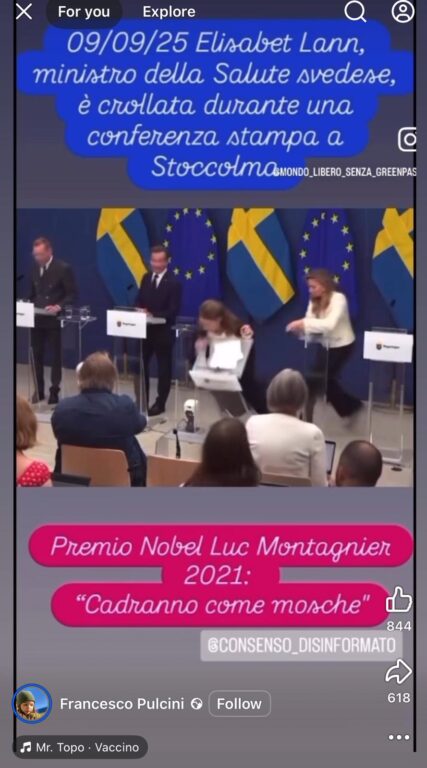 Il 10 settembre 2025, durante una conferenza stampa a Stoccolma, la ministra svedese della Salute Elisabet Lann ha avuto un malore ed è svenuta davanti alle telecamere. Il video ha rapidamente fatto il giro dei social network, diventando oggetto di speculazioni. In particolare, su Facebook e Instagram è stato rilanciato da pagine note per diffondere contenuti no-vax. Il filmato è stato accompagnato dall’affermazione che lo svenimento sarebbe la prova dei “danni da vaccino” e dalla frase attribuita al Nobel Luc Montagnier: “cadranno come mosche”. In realtà, i fatti sono ben diversi.
