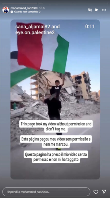 Ha poi rivolto la stessa richiesta, in una storia su Instagram, anche all’account Eye.on.palestine, sempre per l’utilizzo del video senza autorizzazione. Insomma, una questione di copyright e di comprensibile visibilità.