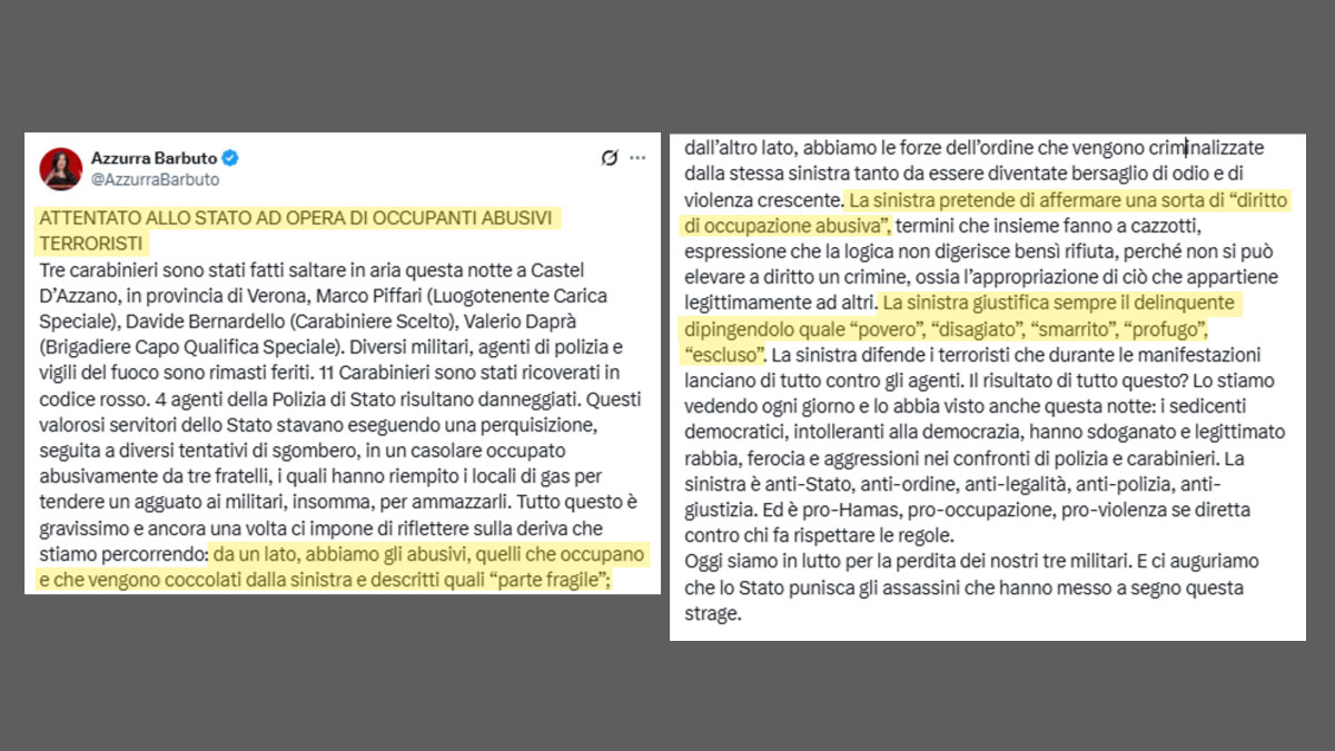 In un post su X, Azzurra Barbuto ha descritto l’accaduto come un «attentato allo Stato ad opera di occupanti abusivi terroristi», definendo questi ultimi «coccolati dalla sinistra e descritti quali “parte fragile”». Poi rincara: «La sinistra giustifica sempre il delinquente dipingendolo quale “povero”, “disagiato”, “smarrito”, “profugo”, “escluso”». L’abitazione dove vivevano da sempre i fratelli Franco, Dino e Maria Luisa Ramponi, era stata ereditata dai genitori.