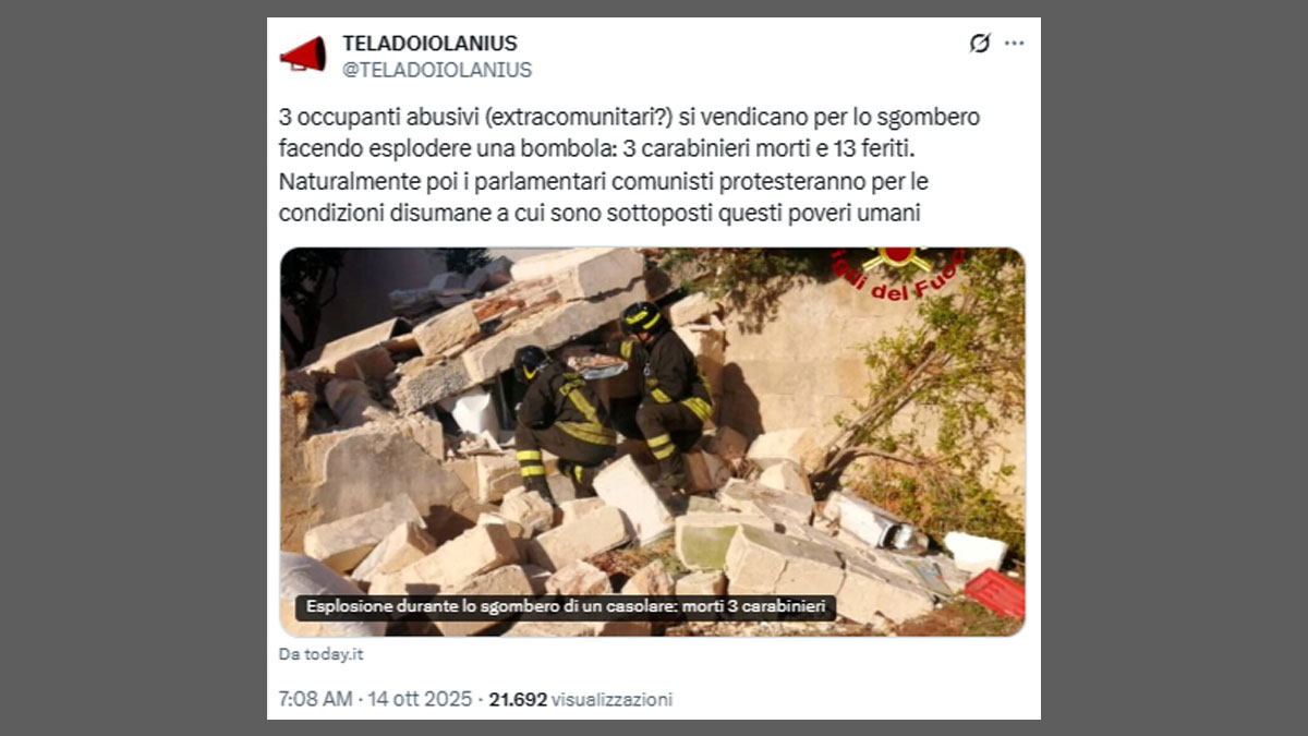 «3 occupanti abusivi (extracomunitari?) si vendicano per lo sgombero facendo esplodere una bombola: 3 carabinieri morti e 13 feriti. Naturalmente poi i parlamentari comunisti protesteranno per le condizioni disumane di questi poveri umani», scrive su X @TELADOIOLANIUS (oltre 52 mila follower), account particolarmente noto nel 2016 perché accusato di far parte di una rete pro-M5s che diffondeva «contenuti di destra, anti-immigrati e pro Trump».
