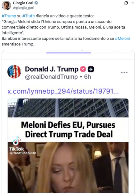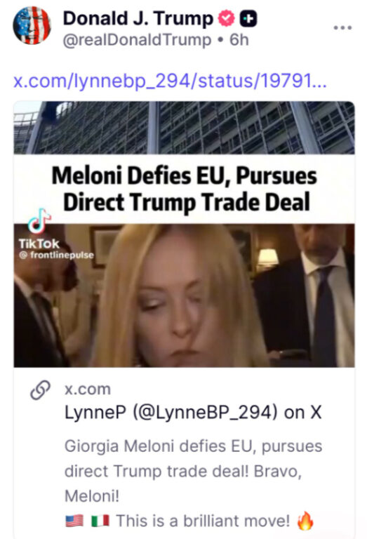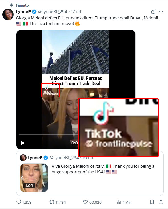 Trump cita come fonte del video l’utente di X LynneP (profilo LynneBP_294), identificata come sostenitrice MAGA (Make America Great Again), la quale nel suo post del 17 ottobre scrive: «Giorgia Meloni sfida l’Unione europea e persegue un accordo commerciale diretto con Trump. Ben fatto, Meloni. È una mossa brillante».