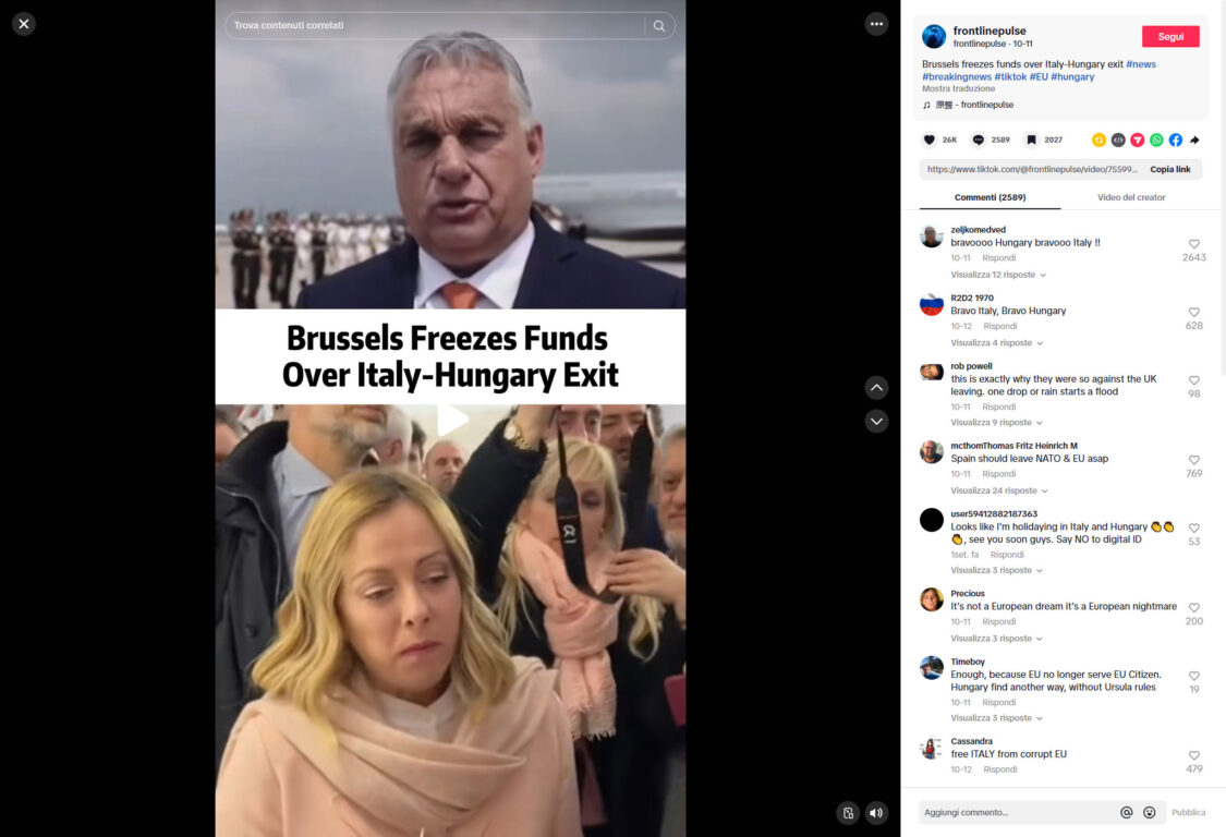 Non è l’unico video in cui viene coinvolta Giorgia Meloni con notizie infondate. In un’altra clip, pubblicata l’11 ottobre 2025, costruita con lo stesso format, si afferma che Bruxelles avrebbe «bloccato i fondi dopo l’uscita di Italia e Ungheria dall’UE».