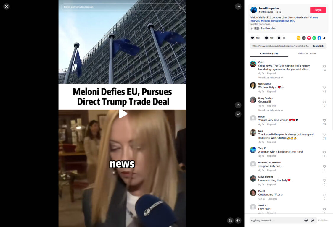 Il 18 ottobre 2025, Donald Trump ha rilanciato su Truth Social un video che attribuisce a Giorgia Meloni posizioni politiche prive di riscontro. Nella clip non si sente mai la voce della Premier, ma solo una voce narrante tipicamente artificiale. Secondo la narrazione riportata dal video, si sostiene che la leader italiana avrebbe deciso di siglare nuovi accordi bilaterali con Washington, scavalcando l’Unione europea, e di voler ridimensionare il sostegno all’Ucraina. Il filmato, costruito come un servizio televisivo, non proviene da fonti ufficiali, ma da un piccolo account TikTok che pubblica regolarmente video simili, falsi o privi di fondamento.