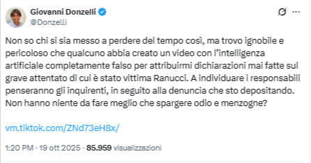 Non so chi si sia messo a perdere del tempo così, ma trovo ignobile e pericoloso che qualcuno abbia creato un video con l’intelligenza artificiale completamente falso per attribuirmi dichiarazioni mai fatte sul grave attentato di cui è stato vittima Ranucci. A individuare i responsabili penseranno gli inquirenti, in seguito alla denuncia che sto depositando. Non hanno niente da fare meglio che spargere odio e menzogne?