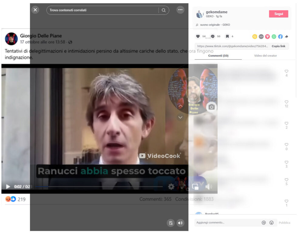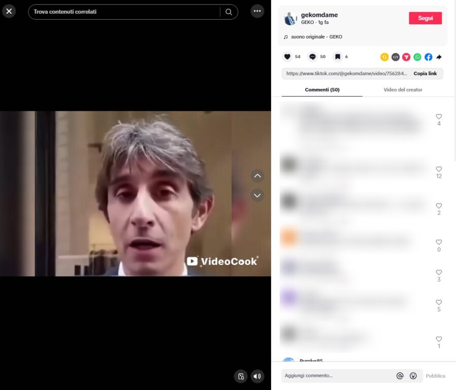 Nel post, Donzelli riporta il link a un video TikTok pubblicato dall’utente @gekomdame. Non si tratta dell’autore della clip, la quale risulta tagliata rispetto all’originale.