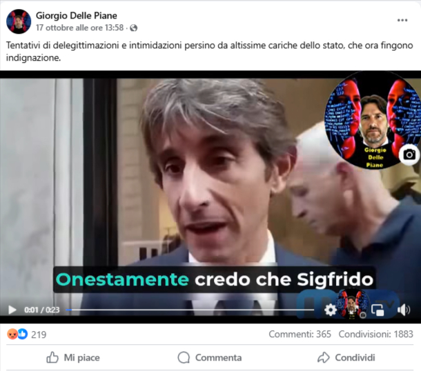La fonte originale del video falso è l’account Facebook “Giorgio Delle Piane”. Ecco il post del 17 ottobre 2025, dove l’utente scrive: