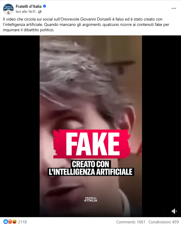 Il video che circola sui social sull’Onorevole Giovanni Donzelli è falso ed è stato creato con l’intelligenza artificiale. Quando mancano gli argomenti, qualcuno ricorre ai contenuti fake per inquinare il dibattito politico.