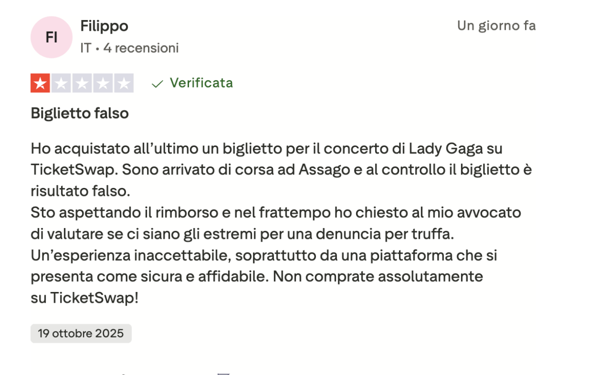 Eppure la piattaforma olandese si presenta come «il modo più sicuro di acquistare e vendere biglietti elettronici», promettendo controlli rigorosi e collaborazione con gli organizzatori. Una reputazione costruita su migliaia di recensioni positive, ma ora incrinata da un’ondata di segnalazioni negative. Un utente racconta su TrustPilot: «Ho acquistato 3 biglietti per Lady Gaga per un totale di 1000€ da 3 persone diverse. Tutti e 3 sono risultati essere FALSI! Allo scanner appariva CODICE INESISTENTE che alla biglietteria ufficiale mi hanno spiegato essere falso». L’utente riferisce di aver provato a contattare il sito, ma senza riuscirsi. «Se avessi voluto farmi truffare avrei acquistato su gruppi Facebook dove tanto quanto il biglietto l’avrei acquistato a sottocosto!», aggiunge. E così molti altri utenti.