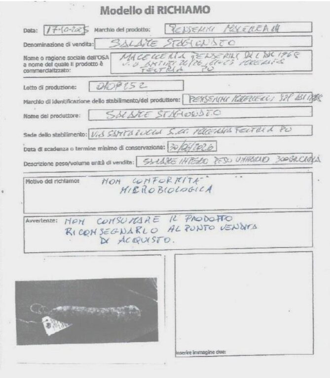 Sul sito del Ministero della Salute è stato pubblicato l’avviso di richiamo di prodotto alimentare per un lotto di salame stagionato, venduto dall’azienda Macelleria Penserini delle Marche e distribuito in commercio. L’avviso è stato pubblicato nella sezione dei richiami dedicata agli operatori alimentari. Il provvedimento riguarda prodotti distribuiti con il lotto 0109252 e data di scadenza fissata al 30 giugno 2026.