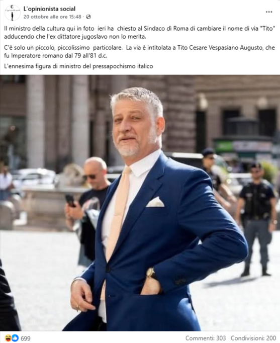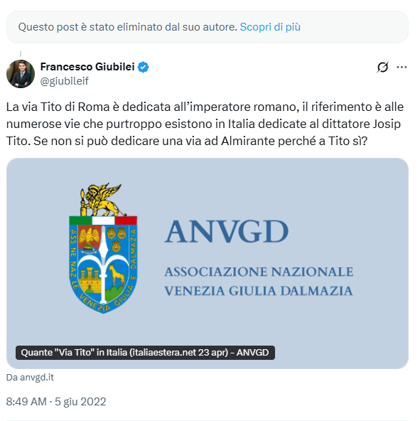 Non è stato il ministro della Cultura Giuli a chiedere il cambio nome di via Tito a Roma. Tale richiesta risalirebbe a un tweet del 2022 pubblicato da Francesco Giubilei, ex consigliere dell’allora ministro della Cultura Sangiuliano.
