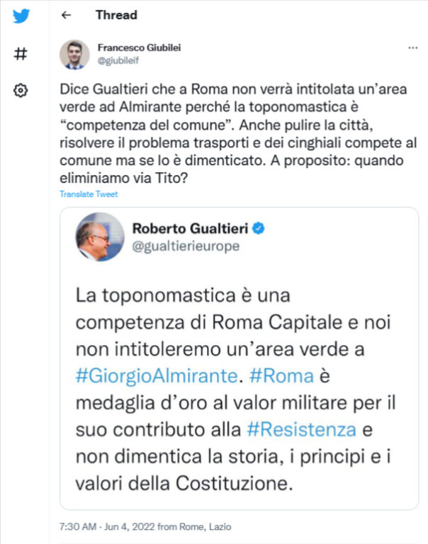 Dice Gualtieri che a Roma non verrà intitolata un’area verde ad Almirante perché la toponomastica è “competenza del comune”. Anche pulire la città, risolvere il problema trasporti e dei cinghiali compete al comune ma se lo è dimenticato. A proposito: quando eliminiamo via Tito?
