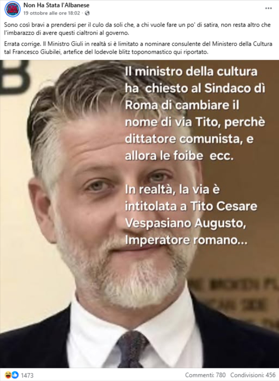 Errata corrige. Il Ministro Giuli in realtà si è limitato a nominare consulente del Ministero della Cultura tal Francesco Giubilei, artefice del lodevole blitz toponomastico qui riportato.