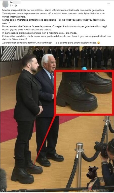 Ma che scarpe ridicole per un politico… siamo ufficialmente entrati nella commedia geopolitica. Zelensky con quelle zeppe sembra pronto più a esibirsi in un concerto delle Spice Girls che a un vertice internazionale. Manca solo il microfono glitterato e la coreografia “Tell me what you want, what you really really want…” Forse pensava che l’altezza facesse la potenza. O magari è solo un modo per guardare dritto negli occhi i giganti della NATO senza usare la scala. In ogni caso, la diplomazia mondiale non è mai stata così… alla moda. Chi avrebbe mai detto che la nuova arma politica del secolo non fosse il gas, ma un paio di stivali con rialzo da 10 centimetri? Zelensky non conquista territori, ma centimetri — e a quanto pare, anche qualche risata.
