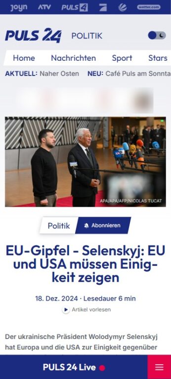 L’uomo insieme a Zelensky pare essere il Presidente del Consiglio UE Antonio Costa, ma il suo volto risulta deformato. Attraverso una ricerca inversa, è possibile riscontrare lo scatto originale sul sito austriaco Puls24, pubblicato nel dicembre 2024. Lo scatto risale al 19 dicembre di quell’anno.