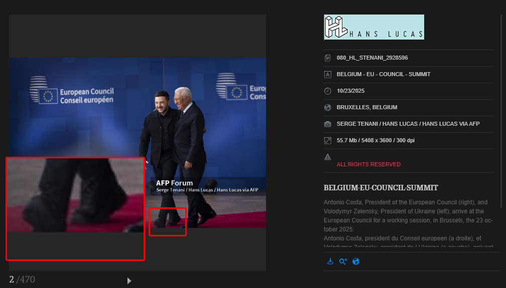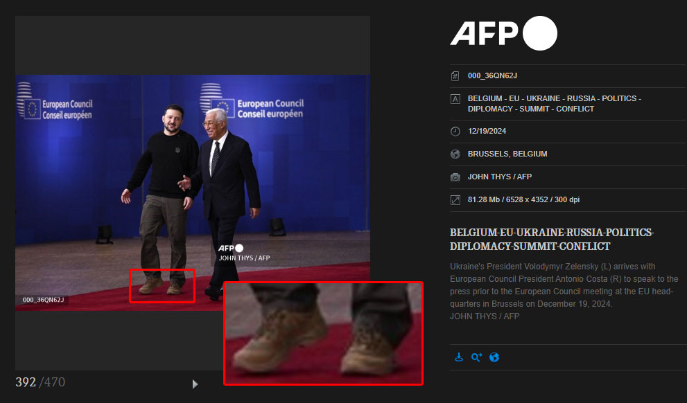 Sfogliando la galleria di AFP, da dove viene lo scatto pubblicato da Puls24, troviamo uno scatto precedente dove è possibile osservare il tipo di scarpe indossato da Zelensky: