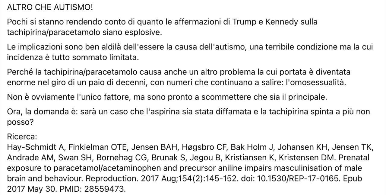 Circolando diverse condivisioni Facebook (per esempio qui, qui e qui), dove si sostiene che il Paracetamolo non sarebbe collegato solo all’autismo, come è stato affermato in una recente conferenza da Donald Trump. Viene citato uno studio a sostegno di tale associazione con l’omosessualità, secondo tali narrazioni, ignorando come l’orientamento sessuale non sia né una patologia né una neurodivergenza. In realtà, lo studio, oltre ad avere dei limiti rilevanti, spiega altro.