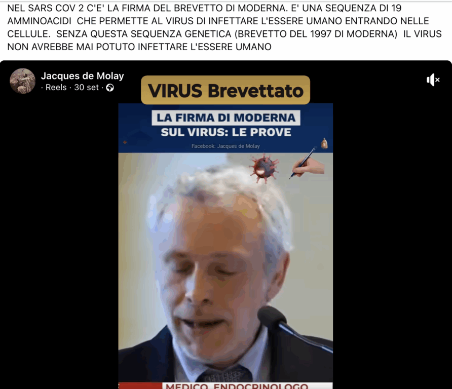 Circola su Facebook la narrazione secondo cui nella sequenza genetica del Sars-Cov-2 ci sarebbero tracce di sequenze brevettate da Moderna risalente al 1997. Parliamo della Casa farmaceutica pioniera dei vaccini a mRNA. Si parla anche del cosiddetto «sito di clivaggio della furina» e delle controverse affermazioni espresse in merito dal dottor Giovanni Frajese, figura molto citata negli ambienti No vax, e dal professor Giorgio Palù – all’epoca presidente di AIFA -, simili alle teorie sul nuovo Coronavirus creato o sfuggito da un laboratorio, ancora oggi prive di fondamento, così come le narrazioni riguardo a sequenze inserite artificialmente. Come ci spiegò l’esperto di genomica comparata all’Università di Trieste Marco Gerdol, si tratta di tesi infondate.