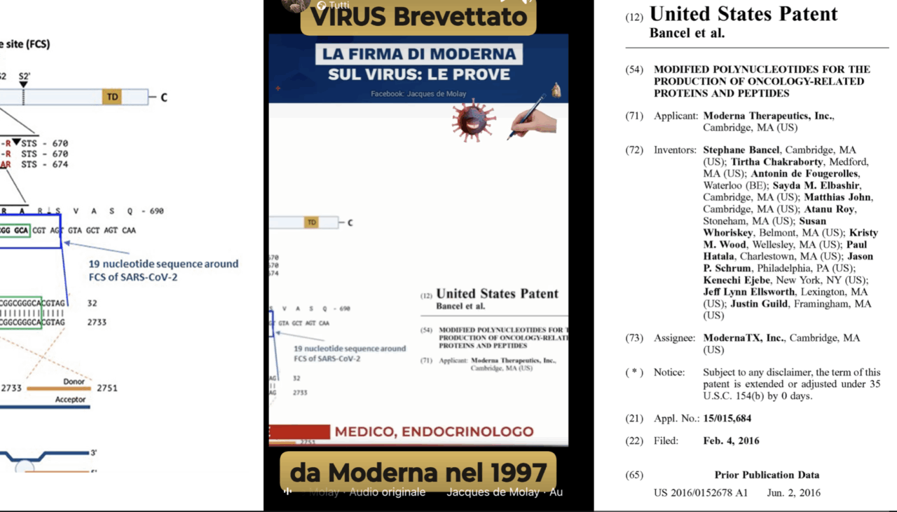 Nel Sars-Cov-2 c’è la firma del brevetto di Moderna. È una sequenza di 19 amminoacidi che permette al virus di infettare l’essere umano entrando nelle cellule. senza questa sequenza genetica (brevetto del 1997 di moderna) il virus non avrebbe mai potuto infettare l’essere umano