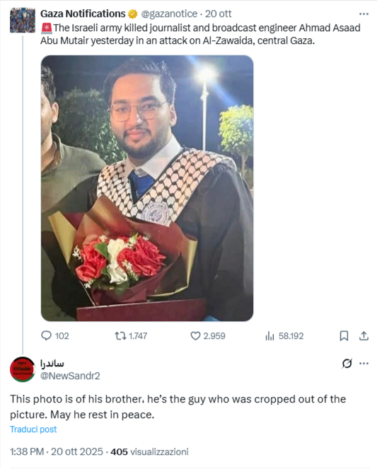 Tra gli account intervenuti sulla vicenda c’è anche Gaza Notifications, accusato da alcuni utenti di aver diffuso per errore la foto del fratello della vittima.