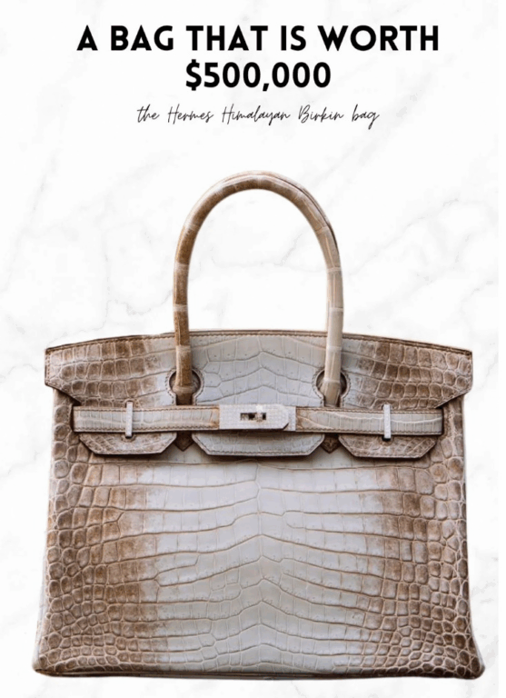 E per accompagnare questo magnifico vestito di Christian Dior, abbiamo scelto una borsa la più icona del mondo intero, è la borsa di Birkin Himalaya, fatto in pelle di coccodrillo con dei diamanti, il valore della borsa è di 450.000€.
