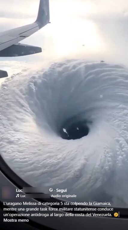 Circola su Instagram, TikTok, Facebook, e X un video che sostiene di mostrare un passeggero che filma l’occhio dell’uragano Melissa dall’alto di un aereo. Il filmato, ha raccolto milioni di visualizzazioni, cavalcando l’onda di attenzione mediatica ricevuta dall’uragano dopo che questi ha colpito i Caraibi e causato gravi danni in Giamaica e Cuba. Tuttavia, il video non è reale, si tratta di un filmato generato con l’intelligenza artificiale. Le analisi e i dati ufficiali infatti dimostrano che nessun aereo avrebbe potuto, o dovuto, compiere un volo simile.