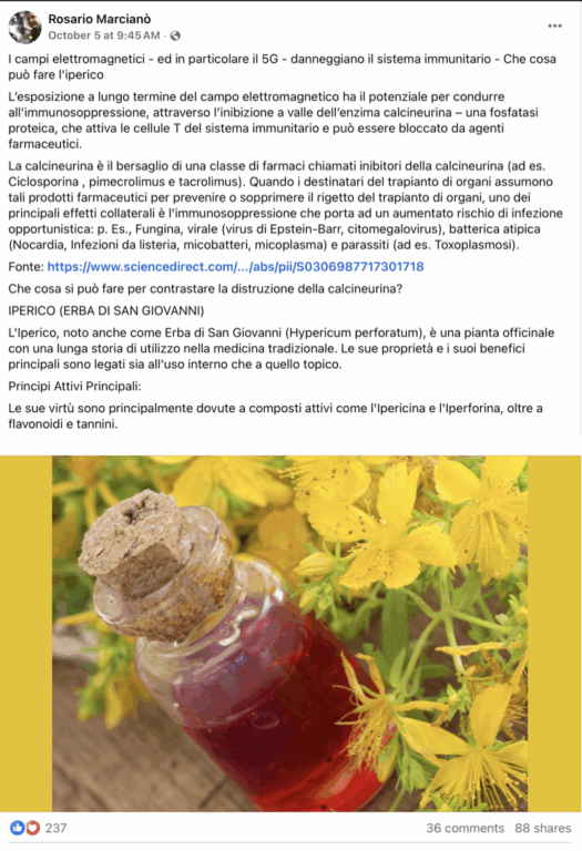 - Secondo Marcianò l’Erba di San Giovanni proteggerebbe contro i fantomatici eventi avversi del 5G.