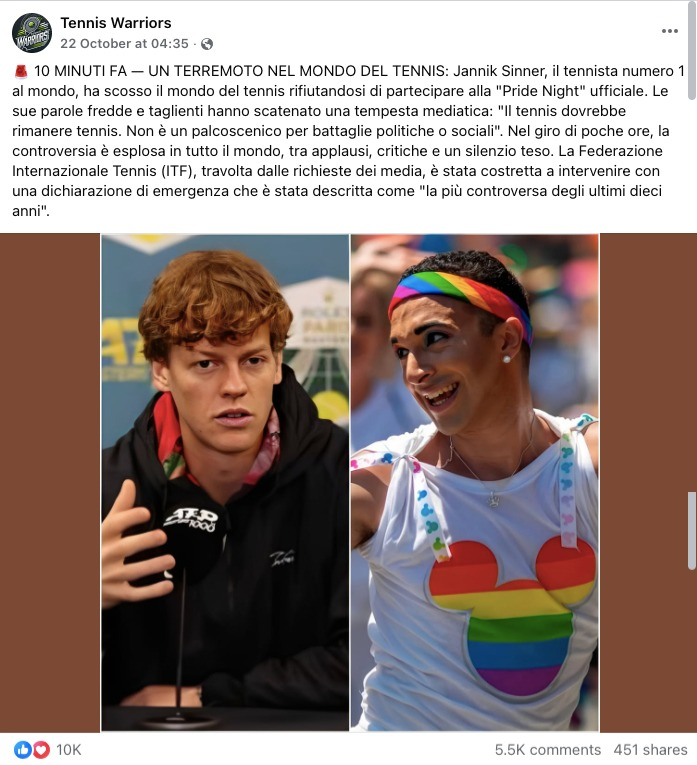 La falsa notizia è stata pubblicata il 17 ottobre 2025 dalla pagina Facebook “Tenis Hoy”, che ha inventato la storia secondo cui Sinner avrebbe rifiutato di partecipare alla “Pride Night del tennis”. La notizia è stata poi ripresa da Tennis Warriors e Elite Tennis Network, tutti siti noti per la diffusione di false notizie sul tennis.