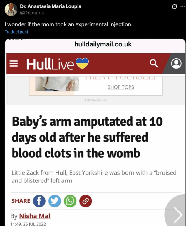 Diverse condivisioni Facebook riportano la notizia riguardante un bimbo amputato a dieci giorni d’età a seguito di coaguli comparsi già nel periodo fetale. Secondo la narrazione No vax si “suggerisce” che la condizione del bambino sarebbe dovuta ai vaccini assunti dalla madre in gravidanza. Si linka anche un “tweet” pubblicato su X.com. A rafforzare la storia la citazione di una presunta “esperta”, la dottoressa Anastasia Maria Loupis.su su X.com