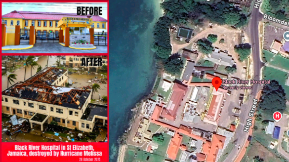 - Anche se il Black River Hospital ha subito danni reali a causa dell’uragano Melissa, le immagini satellitari mostrano che il luogo della foto non coincide.