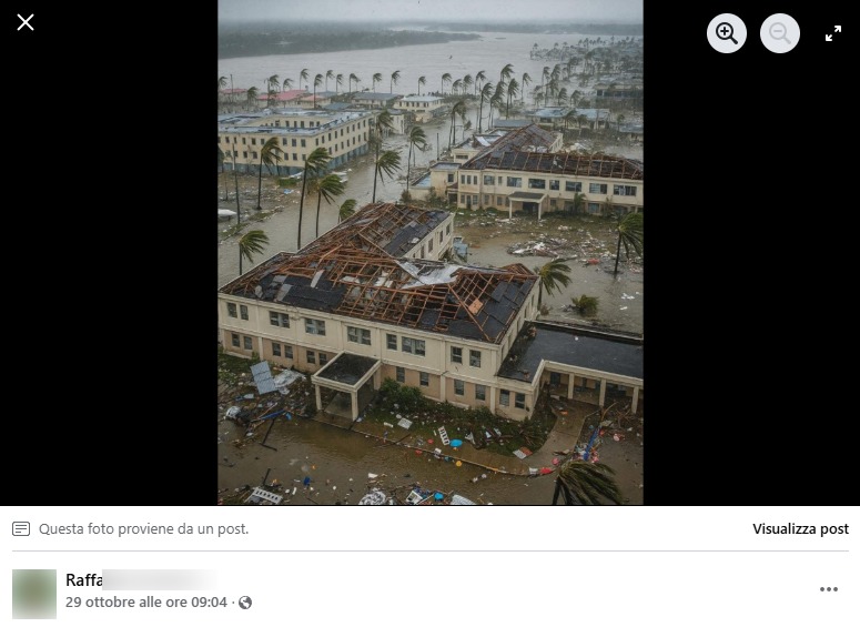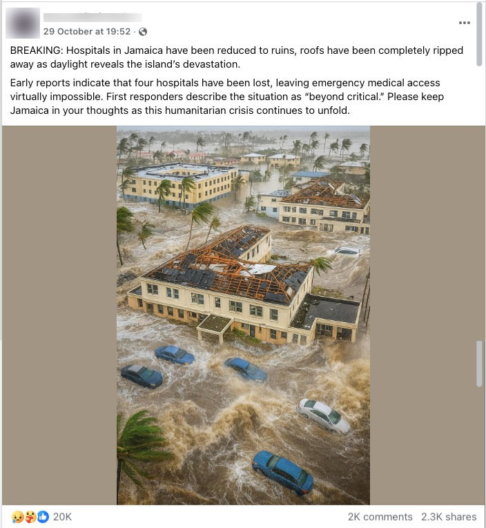 L’uragano Melissa ha colpito duramente la Giamaica a fine ottobre 2025, provocando allagamenti, danni a infrastrutture e interruzioni di corrente in gran parte dell’isola. Nei giorni successivi al disastro, sui social network sono circolate numerose foto e video che mostravano la presunta distruzione causata dalla tempesta — tra cui però diversi contenuti falsi o manipolati. Uno tra questi è l’immagine che mostrerebbe il Black River Hospital in Giamaica ridotto in macerie. L’immagine, diventata virale, è stata generata con l’intelligenza artificiale.