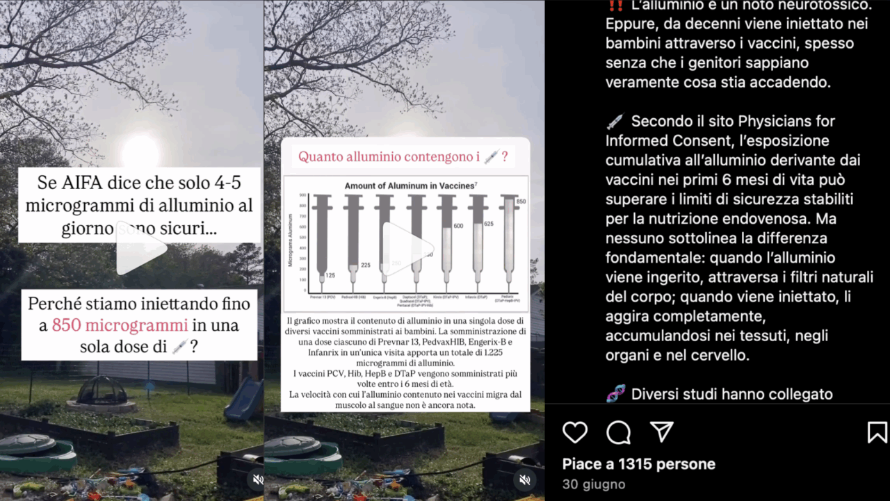 Il testo che si vede alla fine reel proviene da una pagina dell’associazione Physicians for Informed Consent (PIC) riguardo all’alluminio nei vaccini. Si vede un grafico provvisto della seguente didascalia: