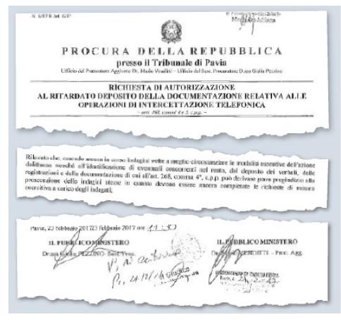 C’è un documento ufficiale della Procura di Pavia datato 23 febbraio 2017, intitolato «Richiesta di autorizzazione al ritardato deposito della documentazione relativa alle operazioni di intercettazione telefonica». L’atto, firmato da Venditti e dalla collega Giulia Pezzino, motivava la necessità di rinviare il deposito delle intercettazioni per «non compromettere il prosieguo delle indagini» e consentire agli inquirenti di valutare «le modalità esecutive dell’azione delittuosa».