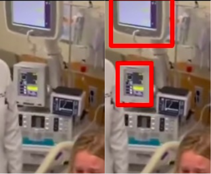 Osservando la clip emergono numerosi particolari incoerenti. Innanzitutto, i macchinari ospedalieri risultano accesi ma privi di qualsiasi dato reale.