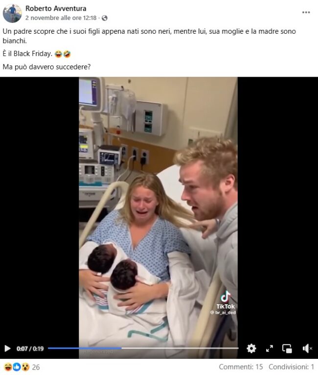 Un video diventato virale su TikTok mostra una presunta scena di caos in un ospedale: un uomo bianco urla all’interno di una sala parto dove la sua compagna, anche lei bianca, ha appena dato alla luce due gemelli neri. I medici cercano di calmarlo mentre la donna piange a dirotto. Il filmato, presentato come una situazione reale, è stato rilanciato da numerosi utenti che lo hanno creduto autentico. Ma osservandolo con attenzione, emergono diversi elementi che ne svelano l’origine artificiale.